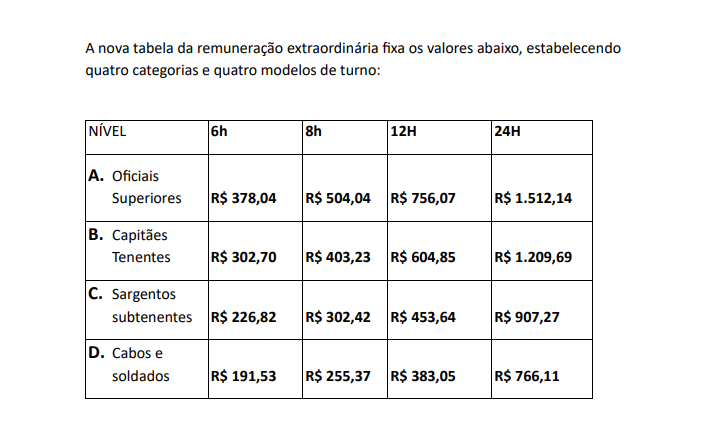 O coronel Menezes se refere a duas novidades inseridas no decreto que formalizou as mudanças. Uma delas é a criação de uma nova categoria, a de sargentos e subtenentes, uma forma de prestigiar os policiais mais antigos. A partir de agora, serão quatro categorias, todas devidamente reajustadas: 1) oficial superior; 2) tenentes e capitães; 3) sargentos e subtenentes; 4) soldados e cabos.